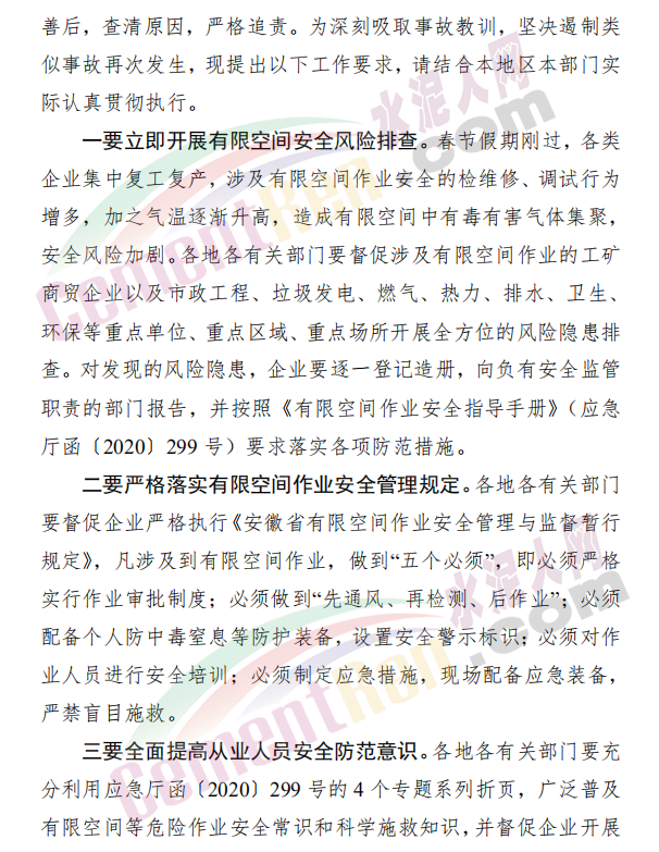 春節(jié)假期剛過(guò),各類企業(yè)集中復(fù)工復(fù)產(chǎn),涉及有限空間作業(yè)安全的檢維修、調(diào)試行為增多,加之氣溫逐漸升高,造成有限空間中有毒有害氣體集聚,安全風(fēng)險(xiǎn)加劇。各地各有關(guān)部門要督促涉及有限空間作業(yè)的工礦商貿(mào)企業(yè)以及市政工程、垃圾發(fā)電、燃?xì)?、熱力、排水、衛(wèi)生、環(huán)保等重點(diǎn)單位、重點(diǎn)區(qū)域、重點(diǎn)場(chǎng)所開(kāi)展全方位的風(fēng)險(xiǎn)隱患排查。對(duì)發(fā)現(xiàn)的風(fēng)險(xiǎn)隱患,企業(yè)要逐一登記造冊(cè),向負(fù)有安全監(jiān)管職責(zé)的部門報(bào)告,并按照《有限空間作業(yè)安全指導(dǎo)手冊(cè)》(應(yīng)急廳函〔2020〕299號(hào))要求落實(shí)各項(xiàng)防范措施。