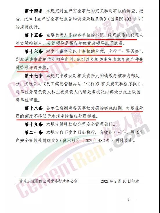 據(jù)水泥人網(wǎng)了解,金隅冀東內(nèi)部一直都有規(guī)定,凡發(fā)生事故的企業(yè)從上至下全部處以金額不等的罰款,年終獎勵也按比例減少,相關責任人甚至會被降職或者辭退。