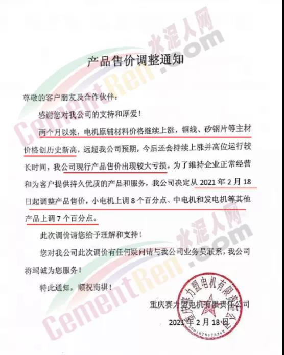 重慶賽力盟電機(jī)有限責(zé)任公司通知,兩個(gè)月以來(lái),電機(jī)原輔材料價(jià)格繼續(xù)上漲,銅線(xiàn)、矽鋼片等主材價(jià)格創(chuàng)歷史新高,遠(yuǎn)超公司預(yù)期,今后還會(huì)持續(xù)上漲并高位運(yùn)行較長(zhǎng)時(shí)間,公司現(xiàn)行產(chǎn)品售價(jià)出現(xiàn)較大虧損。為了維持企業(yè)正常經(jīng)營(yíng)和為客戶(hù)提供持久優(yōu)質(zhì)的產(chǎn)品和服務(wù),決定從2021年2月18日起調(diào)整產(chǎn)品售價(jià),小電機(jī)上調(diào)8個(gè)百分點(diǎn)、中電機(jī)和發(fā)電機(jī)等其他產(chǎn)品上調(diào)7個(gè)百分點(diǎn)。