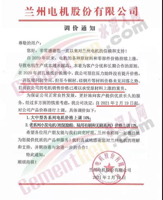 蘭州電機(jī)股份有限公司調(diào)價(jià)通知稱(chēng):自2020年以來(lái),電機(jī)的各種原材料和零部件價(jià)格持續(xù)上漲,導(dǎo)致電機(jī)生產(chǎn)成本越來(lái)越高。本著為客戶(hù)分憂(yōu)和長(zhǎng)期合作的原則,在2020年前幾波漲價(jià)浪潮中,公司頂住壓力始終沒(méi)有提升價(jià)格,一再壓縮利潤(rùn)空間。但至今銅材、硅鋼片等材料價(jià)格未見(jiàn)回落之勢(shì)。目前我公司的電機(jī)銷(xiāo)售價(jià)格已難以承受原材料上漲的重負(fù)。