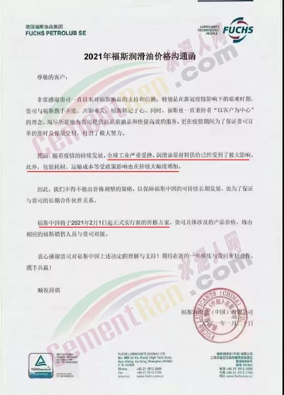 德國(guó)福斯油品集團(tuán)2021年福斯?jié)櫥蛢r(jià)格溝通函提到,隨著疫情的持續(xù)發(fā)展,全球工業(yè)嚴(yán)重受挫,潤(rùn)滑油原材料供給已經(jīng)受到了極大影響。此外,包裝耗材、運(yùn)輸成本等受政策影響也在持續(xù)大幅度增加。福斯中國(guó)將于2021年2月1日起正式實(shí)行新的價(jià)格方案。