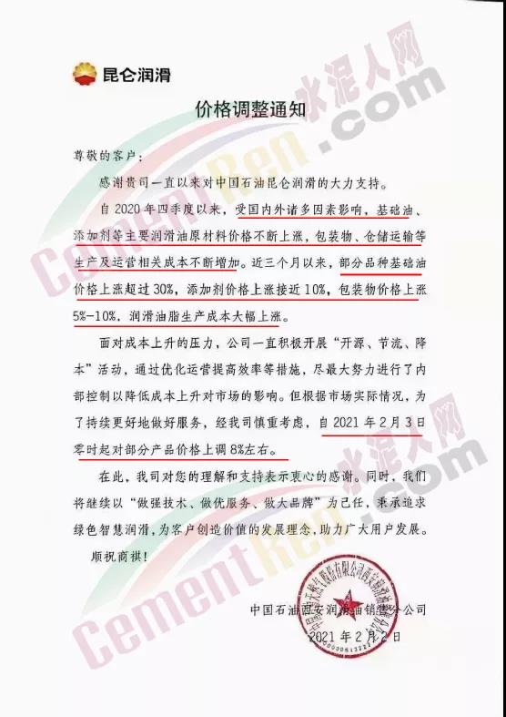 中國(guó)石油昆侖潤(rùn)滑通知,自2020年四季度以來(lái),受?chē)?guó)內(nèi)外諸多因素影響,基礎(chǔ)油、添加劑等主要潤(rùn)滑油原材料價(jià)格不斷上漲,包裝物、倉(cāng)儲(chǔ)運(yùn)輸?shù)壬a(chǎn)及運(yùn)營(yíng)相關(guān)成本不斷增加。近三個(gè)月以來(lái),部分品種基礎(chǔ)油價(jià)格上漲超過(guò)30%,添加劑價(jià)格上漲接近10%,包裝物價(jià)格上漲5%-10%,潤(rùn)滑油脂生產(chǎn)成本大幅上漲。經(jīng)公司慎重考慮,自2021年2月3日零時(shí)起對(duì)部分產(chǎn)品價(jià)格上調(diào)8%左右。