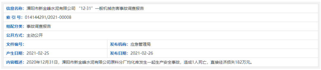 2020年12月31日,溧陽市新金峰水泥有限公司原料分廠均化庫發(fā)生一起生產(chǎn)安全事故,造成1人死亡,直接經(jīng)濟損失182萬元。