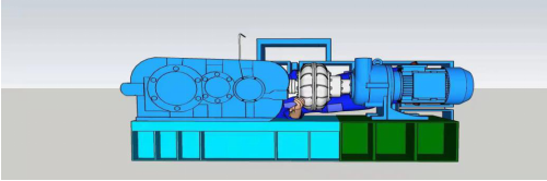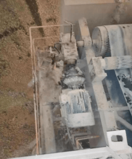 A線均化庫為半球形鋼結構,直徑120米,高37米,均化庫大門朝北,距均化庫大門18.6米處為堆取料機,事發(fā)地點位于堆取料機減速機平臺內(長2.4米,寬0.8米,整體高度為1.6米),由西至東分別為減速器(長0.7米,寬0.55米)、電磁離合器(長0.8米,直徑為0.45米,距平臺底部間隙為0.1米)和取料減速電機(長0.9米,寬0.8米)(如圖四)?,F(xiàn)場勘查發(fā)現(xiàn)與電磁離合器傳動部位脫離的拱形防護罩(寬0.3米,高0.35米)在減速機平臺底部西北側。平臺上電磁離合器傳動部位可見明顯血跡,電磁離合器傳動軸連接處可見衣物碎片(如圖五)。