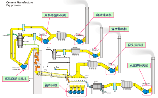 在水泥生產(chǎn)線中,風(fēng)機(jī)是水泥廠的第二大功率消耗設(shè)備群, 一條中等規(guī)模的水泥生產(chǎn)線,僅大型風(fēng)機(jī)就有7-10臺(tái),小型風(fēng)機(jī)百余臺(tái)。