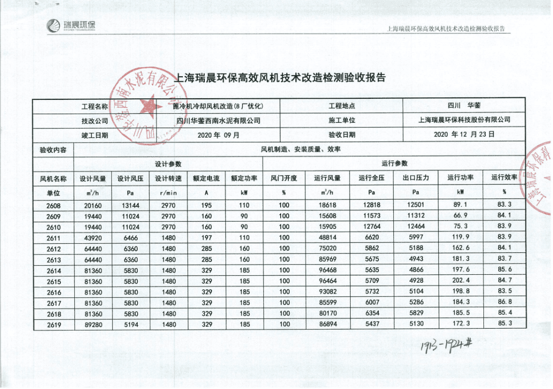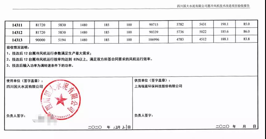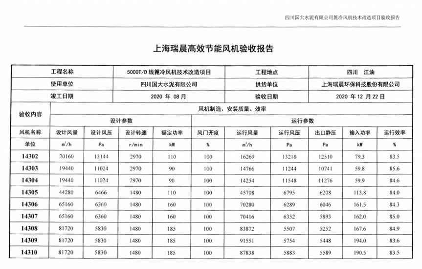 經(jīng)瑞晨環(huán)保改造后,華鎣西南12臺(tái)高效篦冷風(fēng)機(jī)2608-2619運(yùn)行穩(wěn)定,經(jīng)第三方(綿陽(yáng)旗諾)檢測(cè),運(yùn)行效率分別高達(dá)83.30%、84.10%、83.90%、83.90%、84.10%、83.70%、85.60%、84.70%、83.50%、86.80%、85.40%、85.30%,并在熟料提產(chǎn)至6560t/d后12臺(tái)高效篦冷風(fēng)機(jī)噸熟料電耗降低至4.13kWh/t,篦冷機(jī)系統(tǒng)噸熟料電耗降低至4.30kWh/t,滿足技術(shù)合同約定的篦冷機(jī)系統(tǒng)噸熟料電耗≤4.73kWh/t。瑞晨環(huán)保高效篦冷風(fēng)機(jī)配合成都院配套IKN第四代篦冷床的升級(jí)換代項(xiàng)目完美驗(yàn)收,瑞晨環(huán)保高效篦冷風(fēng)機(jī)得到成都院與四川華鎣西南水泥有限公司各層領(lǐng)導(dǎo)以及西南水泥高層的高度認(rèn)可與一致好評(píng)。