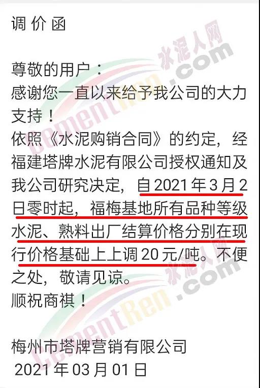 根據(jù)市場(chǎng)情況,經(jīng)研究,決定從2021年3月1日零時(shí)起,本公司發(fā)往福建省內(nèi)各品種各規(guī)格型號(hào)水泥在原價(jià)格基礎(chǔ)上上調(diào)20元/噸。