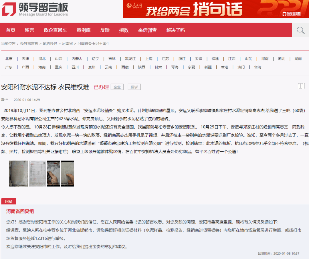 河南省回復(fù):“您好!感謝您對安陽市工作的關(guān)心和對我們的信任,您在人民網(wǎng)給省委書記的留言收悉。對您反映的問題,安陽市委高度重視,現(xiàn)將有關(guān)情況反饋如下:經(jīng)調(diào)查,反映人所在柏寺營鄉(xiāng)位于河北省邯鄲市,請您保留好相關(guān)證據(jù)材料(水泥樣品、檢測報告、經(jīng)銷商進貨票據(jù)等)向您所在地市場監(jiān)管局進行舉報,或撥打市場監(jiān)督服務(wù)熱線12315進行舉報。歡迎您繼續(xù)關(guān)注安陽市的工作,及時給我們提出寶貴的意見和建議。”