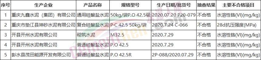 不合格水泥名單顯示,不合格企業(yè)包括重慶九鑫水泥(集團(tuán))有限公司、重慶市墊江縣坤砂水泥有限公司、開縣開州水泥有限公司、彭水縣茂田能源開發(fā)有限公司等四家企業(yè)5個批次,其中42.5級水泥4個批次,32.5級水泥1個批次,生產(chǎn)日期均為2020年7月份。