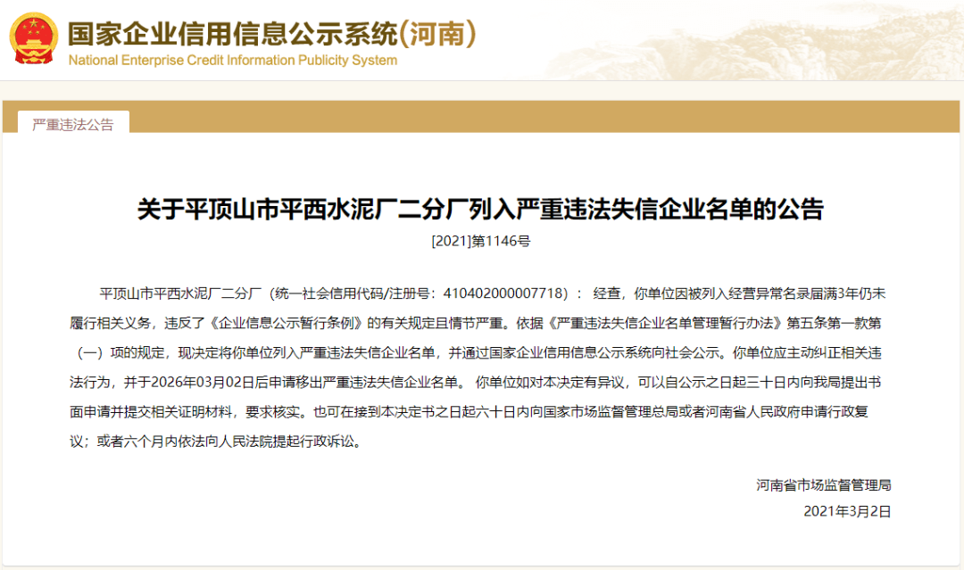 日前,水泥人網(wǎng)從國家企業(yè)信用信息公示系統(tǒng)獲悉,2021年3月2日,河南省市場(chǎng)監(jiān)督管理局發(fā)布關(guān)于平頂山市平西水泥廠二分廠列入嚴(yán)重違法失信企業(yè)名單的公告([2021]第1146號(hào))。
