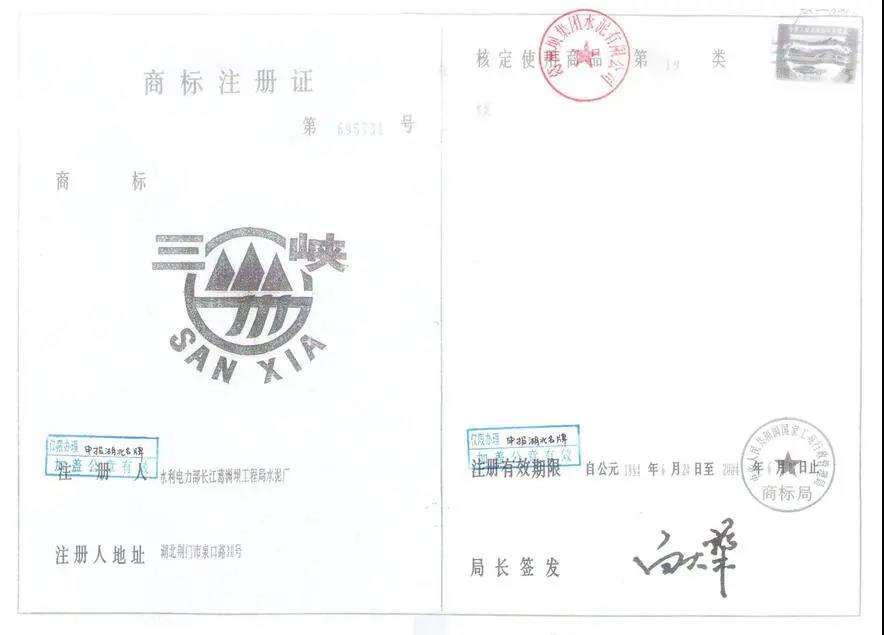 新版“三峽牌”商標(biāo)及商標(biāo)注冊證書