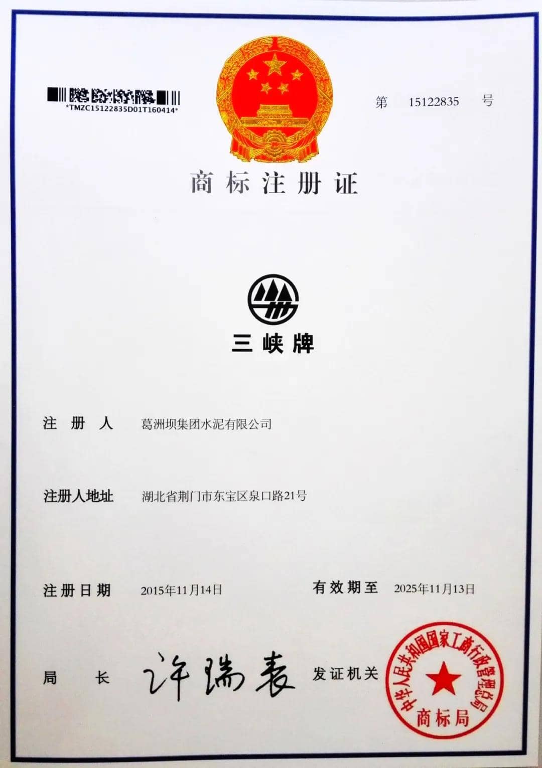 葛洲壩水泥廠從1975年正式投產(chǎn)直至1983年,水泥產(chǎn)品一直沒有正式的商標(biāo)。1980年3月初,湖北省建材局召集部分企業(yè)代表商討80年代湖北建材產(chǎn)品創(chuàng)優(yōu)奪牌工作。為落實(shí)會議精神,葛洲壩水泥廠呈文葛洲壩工程局,提出以600號硅酸鹽大壩水泥作為質(zhì)量創(chuàng)優(yōu)產(chǎn)品,正式擬出“三峽牌”“高峽牌”“江峽牌”等品牌名稱,請工程局確定,同月17日,工程局批復(fù)明確產(chǎn)品為“三峽牌”。1984年3月,經(jīng)國家工商行政管理局批準(zhǔn)注冊。