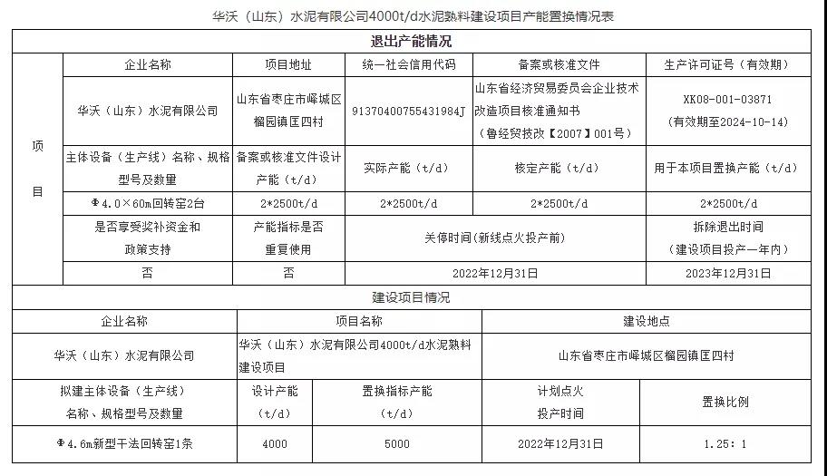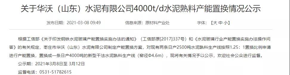 日前,山東省工信廳發(fā)布《關(guān)于華沃(山東)水泥有限公司4000t/d水泥熟料產(chǎn)能置換情況公示》稱:棗莊市華沃水泥有限公司制定產(chǎn)能置換方案,對現(xiàn)有兩條日產(chǎn)2500噸水泥熟料生產(chǎn)線按照1.25:1置換比例申請進行產(chǎn)能置換,置換成一條日產(chǎn)4000噸的新型干法水泥熟料生產(chǎn)線。公示原文如下: