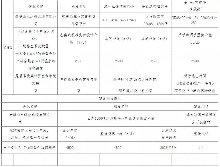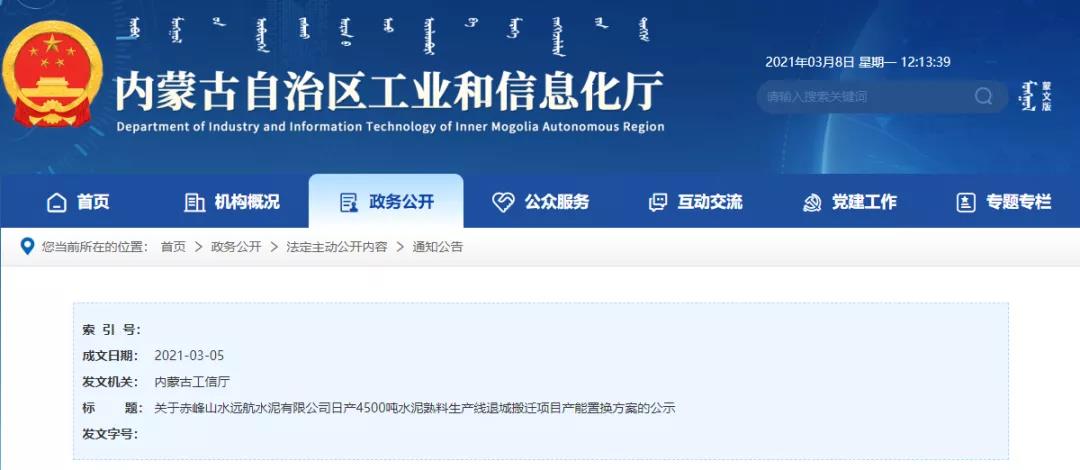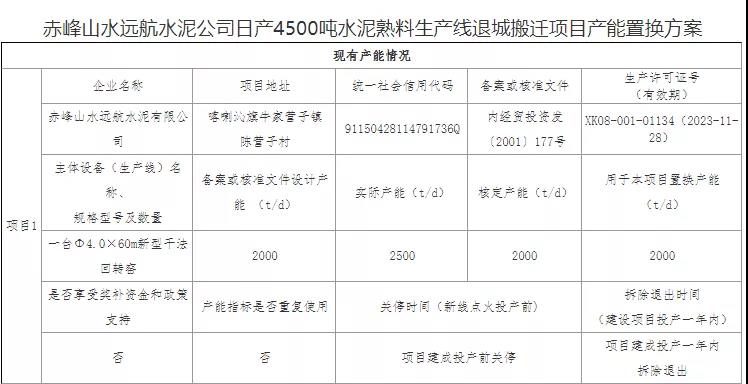 3月5日,內(nèi)蒙古工信廳也發(fā)布了一條《關(guān)于赤峰山水遠航水泥有限公司日產(chǎn)4500噸水泥熟料生產(chǎn)線退城搬遷項目產(chǎn)能置換方案的公示》。公示內(nèi)容為:赤峰山水遠航水泥有限公司擬整合現(xiàn)有1條日產(chǎn)2500噸干法窯水泥生產(chǎn)線、1條日產(chǎn)2000噸干法窯水泥生產(chǎn)線,等量置換在喀喇沁旗十家滿族鄉(xiāng)石灰窯村建設1條日產(chǎn)4500噸水泥熟料生產(chǎn)線。