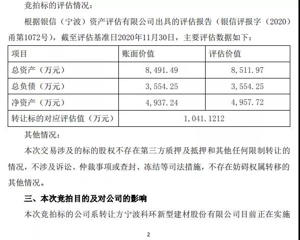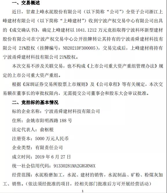 上峰水泥上市公司3月8日發(fā)布公告稱:近日,公司全資子公司浙江上峰建材有限公司,以1041.12萬元競拍取得寧波科環(huán)新型建材股份有限公司在寧波產(chǎn)權(quán)交易中心公開掛牌轉(zhuǎn)讓其持有的寧波甬舜建材科技有限公司21%的股權(quán)。交易完成后,寧波科環(huán)持有甬舜建材79%股份,上峰建材持21%的股份。