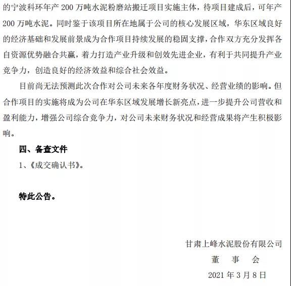 據(jù)悉,甬舜建材是轉(zhuǎn)讓方寧波科環(huán)目前正在實施的年產(chǎn)200萬噸水泥粉磨站搬遷項目實施主體,待項目建成后,可年產(chǎn)200萬噸水泥。