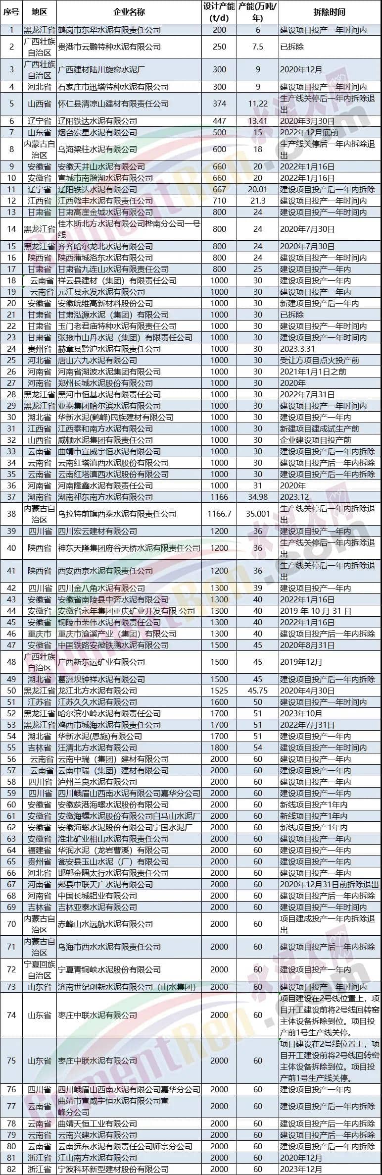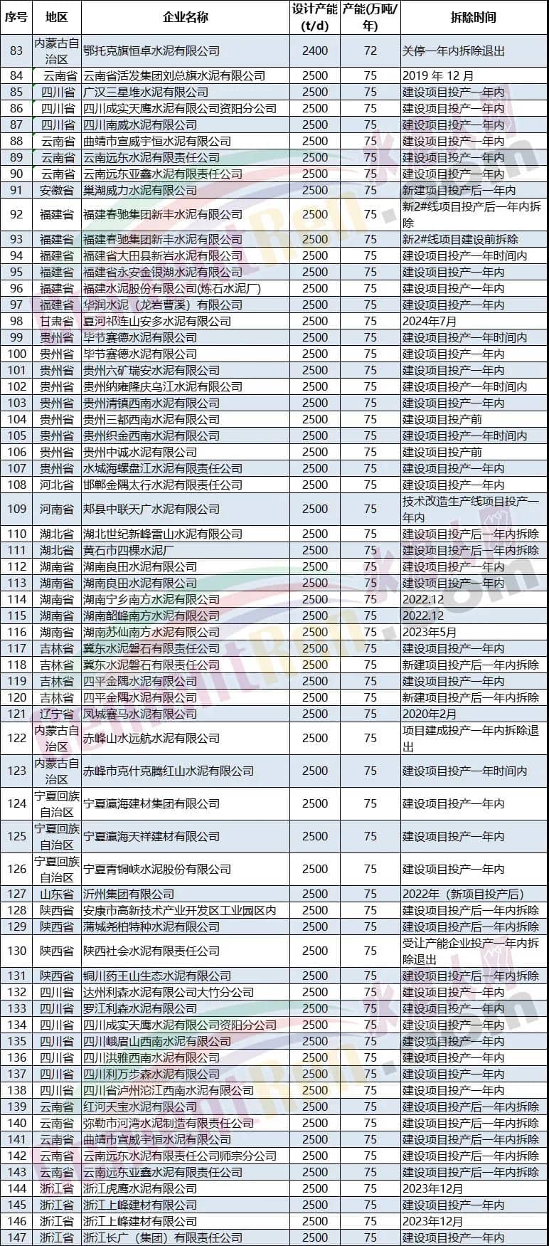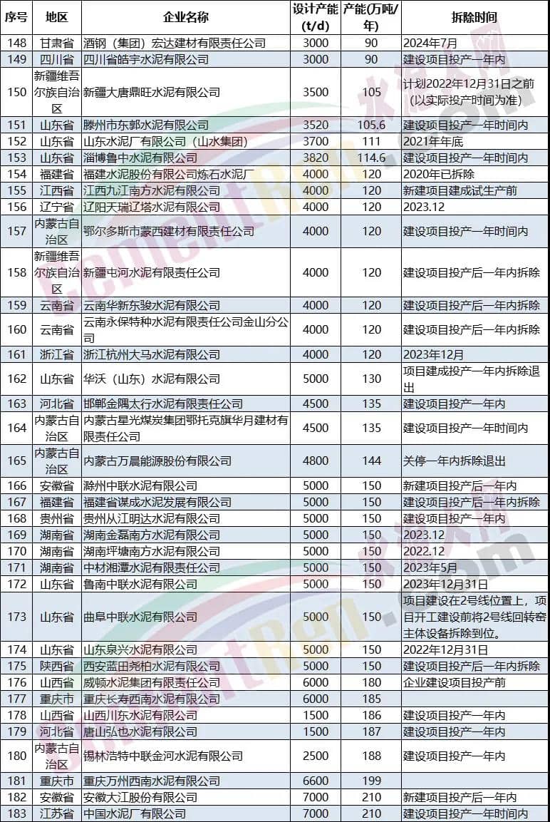 據(jù)不完全統(tǒng)計(jì),近兩年公示公告退出的熟料生產(chǎn)線達(dá)到180多個(gè)項(xiàng)目,合計(jì)退出產(chǎn)能達(dá)到1.32億噸/年。