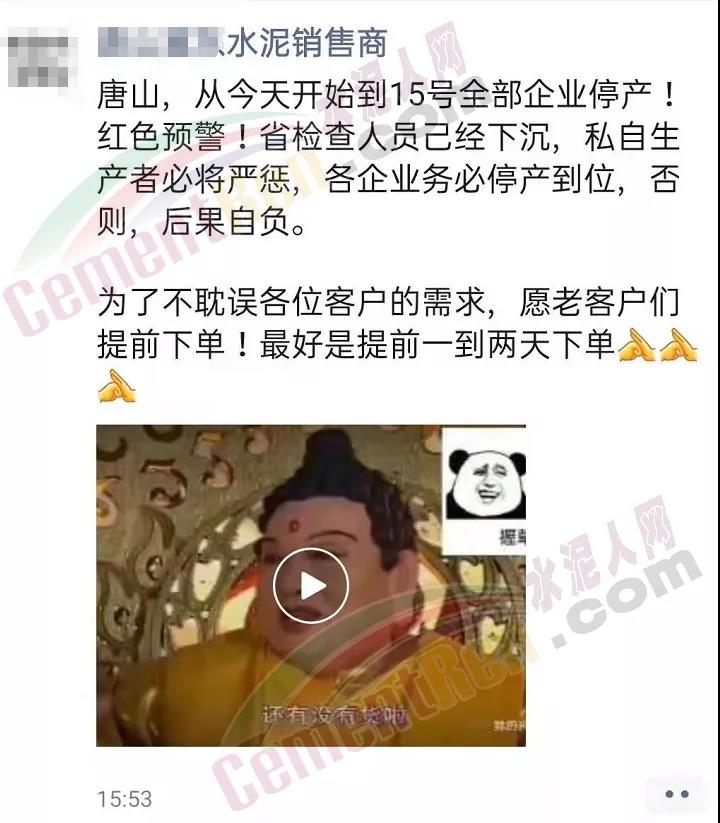 水泥人網(wǎng)通訊員消息:日前有水泥經(jīng)銷商通知,“從12日起到15日河北唐山地區(qū)全部企業(yè)停產(chǎn)!紅色預(yù)警!省檢查人員已經(jīng)下沉,私自生產(chǎn)者必將嚴(yán)懲,各企業(yè)務(wù)必停產(chǎn)到位,否則,后果自負(fù)。為了不耽誤各位客戶的需求,請(qǐng)老客戶提前一到兩天下單。”