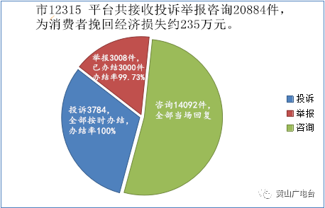 2020年,黃山市12315 平臺共接收投訴舉報咨詢20884件,為消費(fèi)者挽回?fù)p失235萬元。