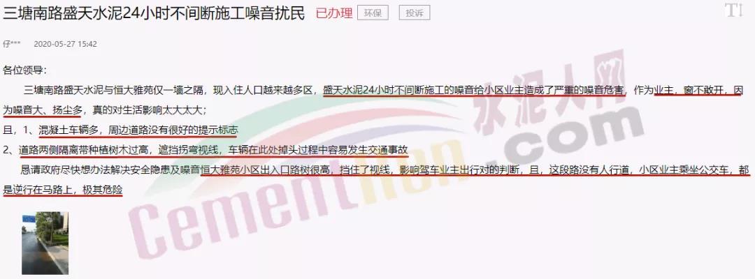 據(jù)水泥人網(wǎng)了解,上述兩家企業(yè)一家為水泥制品工廠,一家為商品混凝生產(chǎn)企業(yè)。且早在2020年5月27日,就有網(wǎng)友在人民網(wǎng)地方留言板給興寧區(qū)委書(shū)記留言稱(chēng),三塘南路盛天水泥24小時(shí)不間斷施工,噪音大、揚(yáng)塵多,業(yè)主不敢開(kāi)窗。而且,混凝土車(chē)輛多,周邊道路沒(méi)有很好的提示標(biāo)志 ,道路兩側(cè)隔離帶種植樹(shù)木遮擋拐彎視線,車(chē)輛在此處極容易發(fā)生交通事故。