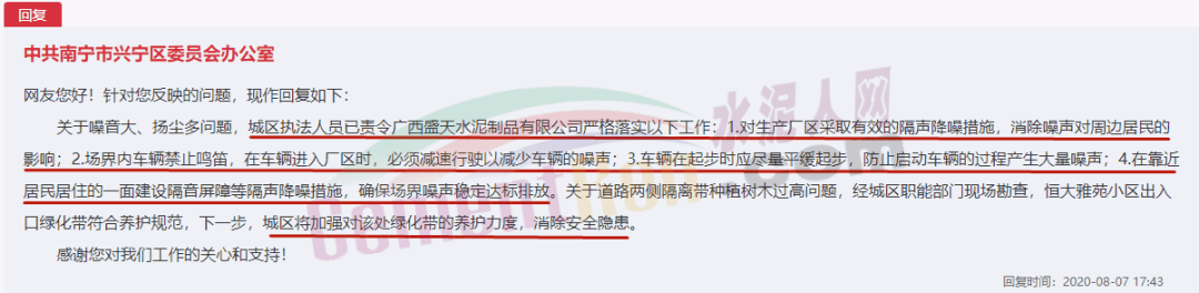 中共南寧市興寧區(qū)委員會(huì)辦公室于2020年8月7日回復(fù)稱(chēng)城區(qū)執(zhí)法人員已責(zé)令廣西盛天水泥制品有限公司采取相關(guān)措施整治噪音和揚(yáng)塵問(wèn)題。關(guān)于道路兩側(cè)隔離帶種植樹(shù)木過(guò)高問(wèn)題,城區(qū)將加強(qiáng)對(duì)該處綠化帶的養(yǎng)護(hù)力度,消除安全隱患。