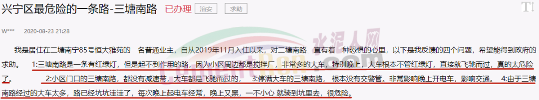 但是,2020年8月23日,又有網(wǎng)友在人民網(wǎng)地方留言板留言稱(chēng),三塘南路是興寧區(qū)最危險(xiǎn)的一條路,紅綠燈起不到作用,沒(méi)有減速帶,沒(méi)有交警管,周邊攪拌廠的大車(chē)都是直接就飛馳而過(guò),非常危險(xiǎn)。而且由于三塘南路經(jīng)過(guò)的大車(chē)太多,路坑坑洼洼,晚上又黑,一不小心就騎到坑里去,很危險(xiǎn)。