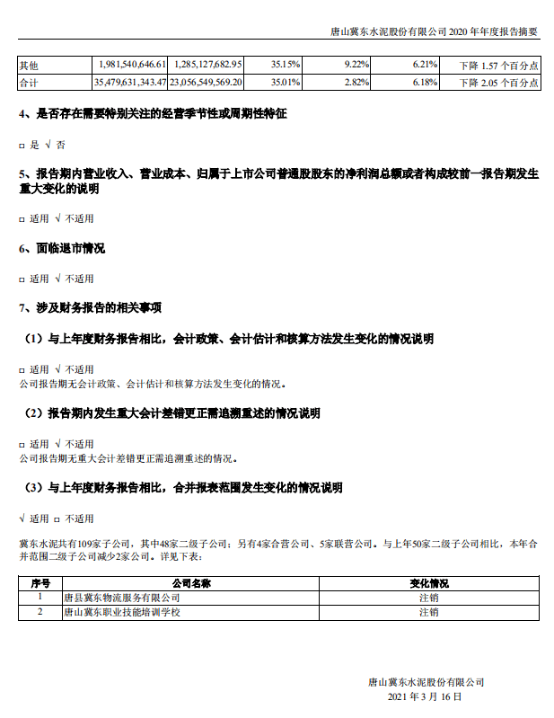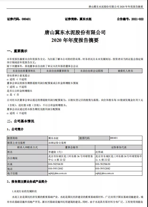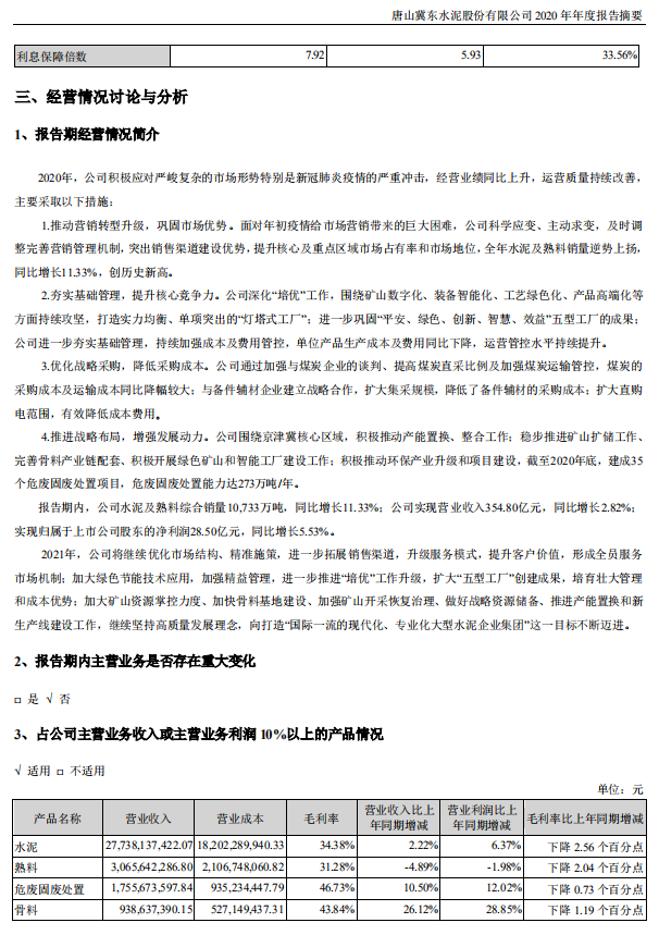 2020 年度,面對(duì)新冠肺炎疫情及水泥、熟料價(jià)格下降帶來(lái)的不利影響,公司積極主動(dòng)作為,進(jìn)一步提升管理效能,積極推進(jìn)生產(chǎn)企業(yè)“培優(yōu)”,運(yùn)營(yíng)質(zhì)量持續(xù)提升;持續(xù)加強(qiáng)成本及費(fèi)用管控,單位產(chǎn)品生產(chǎn)成本及費(fèi)用同比下降;強(qiáng)化戰(zhàn)略營(yíng)銷(xiāo)的實(shí)施,市場(chǎng)基礎(chǔ)進(jìn)一步夯實(shí),結(jié)構(gòu)進(jìn)一步優(yōu)化,水泥、熟料銷(xiāo)量同比提升。公司歸屬于上市公司股東的凈利潤(rùn)同比上升。