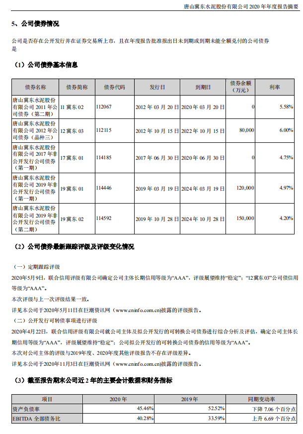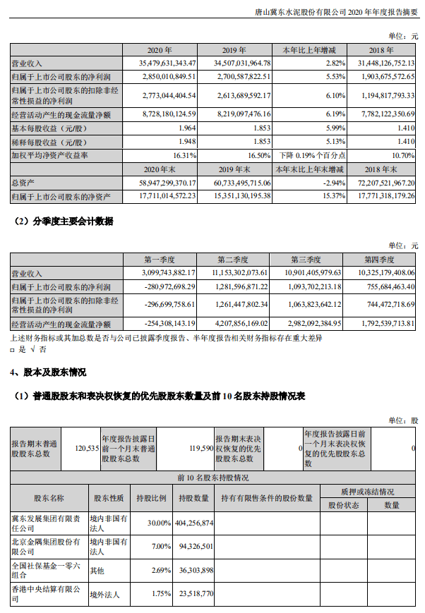 3月16日,冀東水泥發(fā)布了2020年年報(bào)。公司實(shí)現(xiàn)營(yíng)業(yè)收入354.8億元,同比增長(zhǎng)2.82%;凈利潤(rùn)28.5億元,同比增長(zhǎng)5.53%。公司水泥及熟料綜合銷(xiāo)量10733萬(wàn)噸,同比增長(zhǎng)11.33%。
