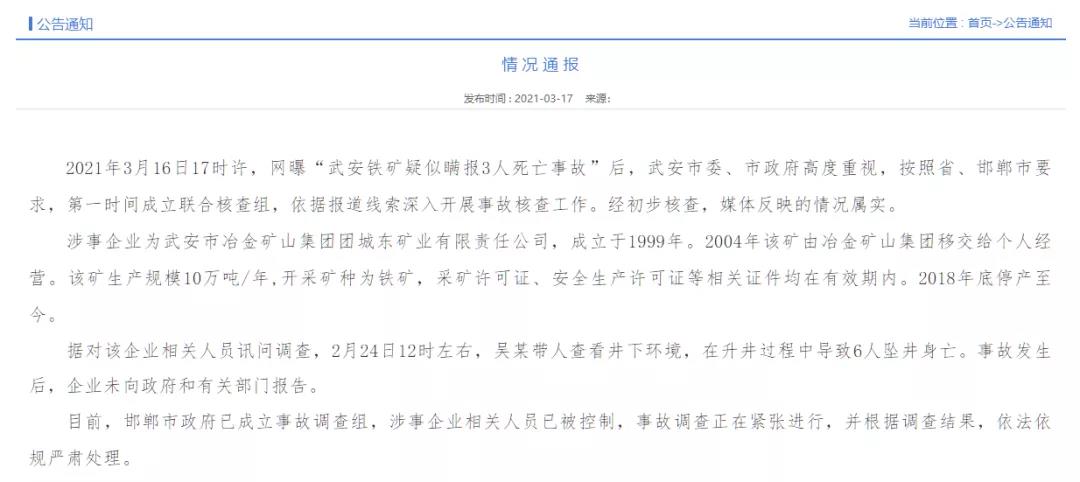 據(jù)武安市人民政府網(wǎng)站17日消息,2021年3月16日17時(shí)許,網(wǎng)曝“武安鐵礦疑似瞞報(bào)3人死亡事故”后,武安市委、市政府高度重視,按照省、邯鄲市要求,第一時(shí)間成立聯(lián)合核查組,依據(jù)報(bào)道線索深入開(kāi)展事故核查工作。經(jīng)初步核查,媒體反映的情況屬實(shí)。