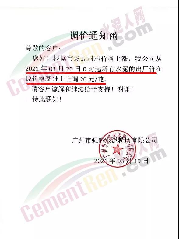 廣州市強(qiáng)盛水泥粉磨有限公司通知自3月20日0時起所有水泥的出廠價(jià)在原價(jià)格基礎(chǔ)上上調(diào)20元/噸。