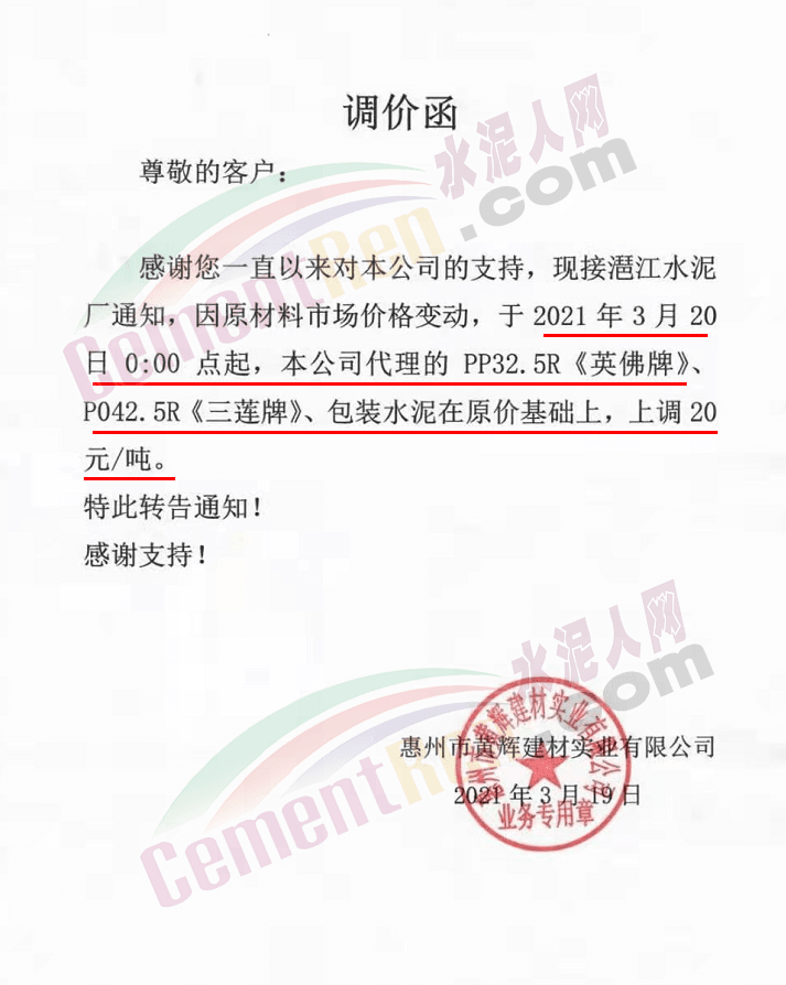 惠州市黃輝建材實(shí)業(yè)有限公司通知,因原材料市場價(jià)格變動,于2021年3月20日 0∶00 點(diǎn)起,本公司代理的 PP32.5R《英佛牌》、 PO42.5R《三蓮牌》、包裝水泥在原價(jià)基礎(chǔ)上上調(diào)20元/噸。