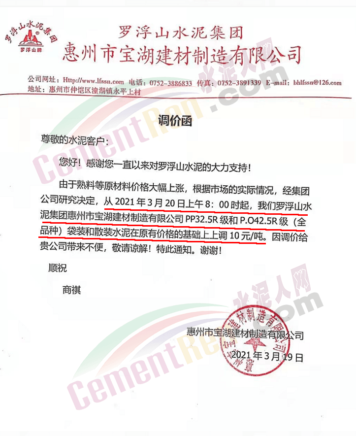 羅浮山水泥集團(tuán)惠州市寶湖建材制造有限公司公司調(diào)價(jià)函稱,由于熟料等原材料價(jià)格大幅上漲,根據(jù)市場的實(shí)際情況,經(jīng)集團(tuán)公司研究決定,從2021年3月20日上午8時起,羅浮山水泥集團(tuán)惠州市寶湖建材制造有限公司PP32.5R級和P.042.5R級(全品種)袋裝和散裝水泥在原有價(jià)格的基礎(chǔ)上上調(diào) 10元/噸。