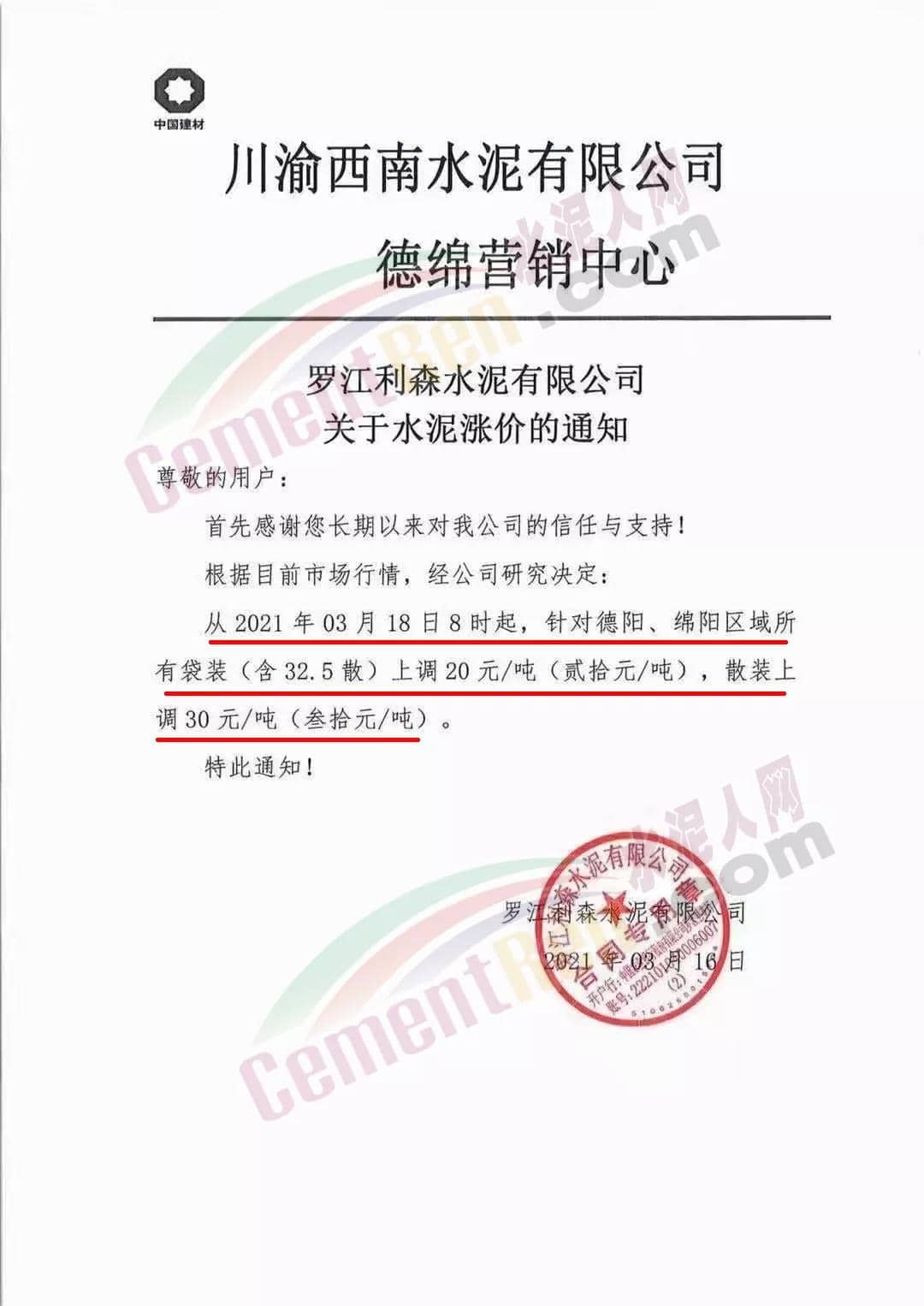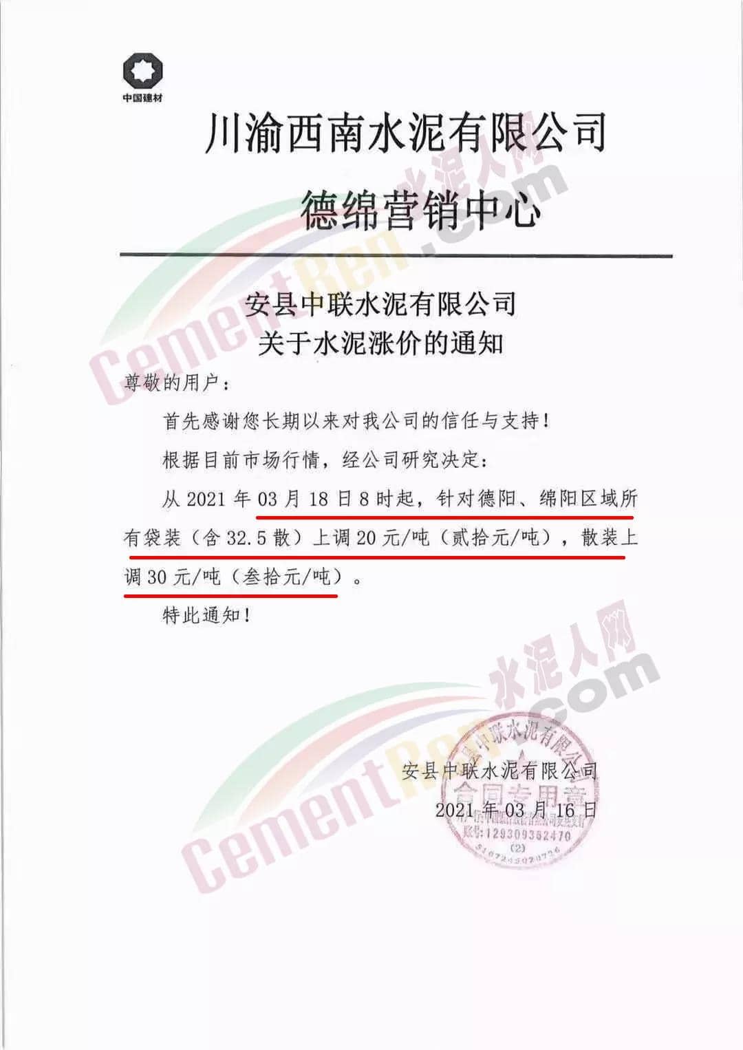 英德市恒亞建材有限公司通知根據(jù)目前原材料上漲及市場行情,自 2021年3月20日零點(diǎn)起,公司生產(chǎn)的P.P32.5R(英翔、英冠、英聯(lián))、M32.5(英冠、英聯(lián))袋裝出廠價(jià)在原有價(jià)格基礎(chǔ)上上調(diào) 20 元/噸。