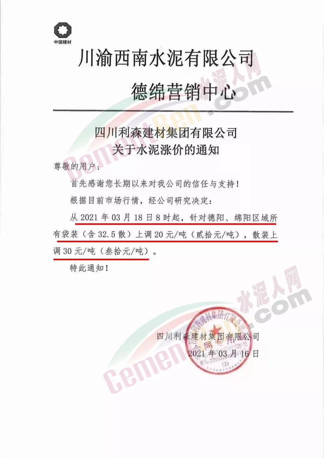 川渝西南水泥有限公司成都營銷中心,四川峨眉山西南水泥有限公司通知自今日(20日)零點(diǎn)起,大成都區(qū)域所有袋裝系列水泥出廠單價(jià)在原基礎(chǔ)上上調(diào)40元/噸。