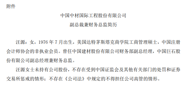 汪源:女,1976年7月出生,美國達特茅斯塔克商學(xué)院工商管理碩士,中國注冊會計師協(xié)會的非執(zhí)業(yè)會員。曾任中國建材股份有限公司財務(wù)部副總經(jīng)理,中國巨石股份有限公司副總經(jīng)理兼財務(wù)總監(jiān)。