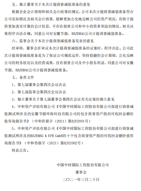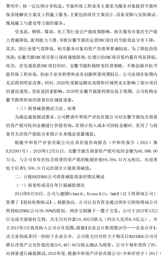 公司同期公告,公司對全資子公司安徽節(jié)源環(huán)??萍加邢薰?“安徽節(jié)源”)計提商譽減值準(zhǔn)備9506.31萬元,對控股子公司德國HAZEMAG EPR GmbH(“HAZEMAG公司”)計提商譽減值準(zhǔn)備846.32萬歐元,折合人民幣6791.72萬元,均計入公司2020年年度損益,使2020年度歸屬于上市公司股東的凈利潤減少1.63億元。