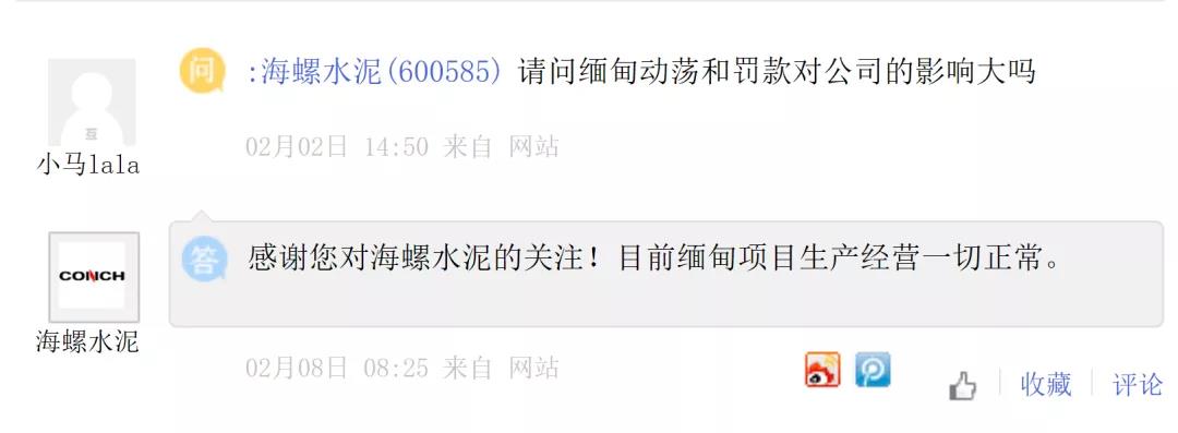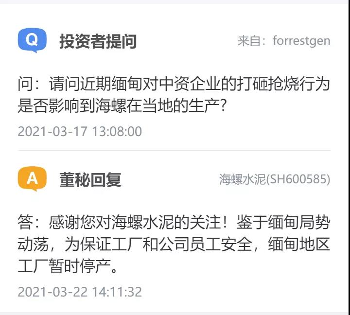 今年2月初,就有投資者在上市平臺(tái)向海螺水泥董秘提問緬甸動(dòng)蕩和罰款對(duì)公司的影響。海螺水泥回答稱,緬甸項(xiàng)目生產(chǎn)經(jīng)營一切正常。