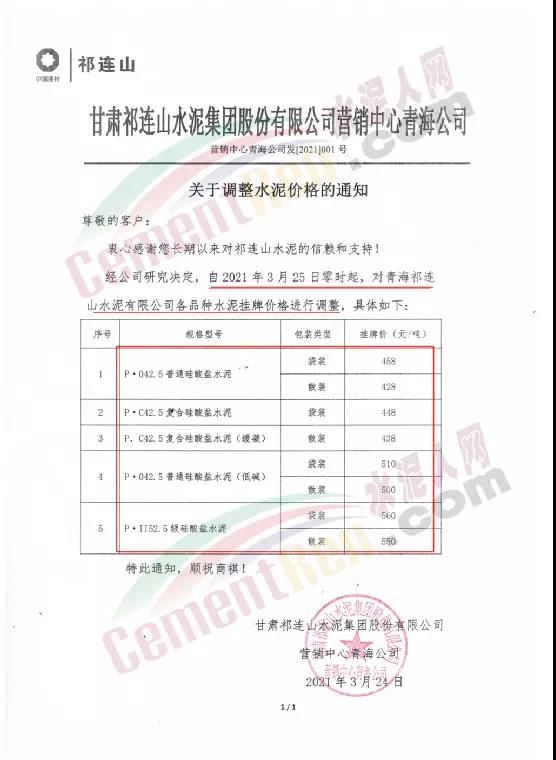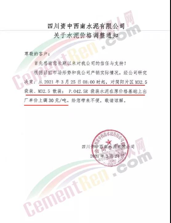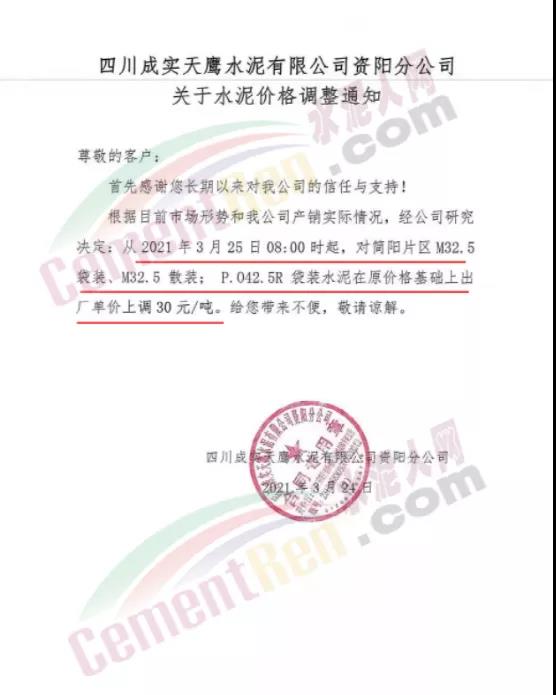 近期,因市場原因,經(jīng)研究決定,自2021年3月26日零時起,各品種散、袋水泥在原有價格基礎上上調(diào)30元/噸。