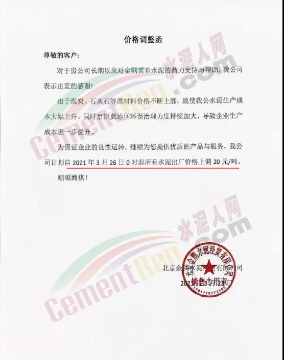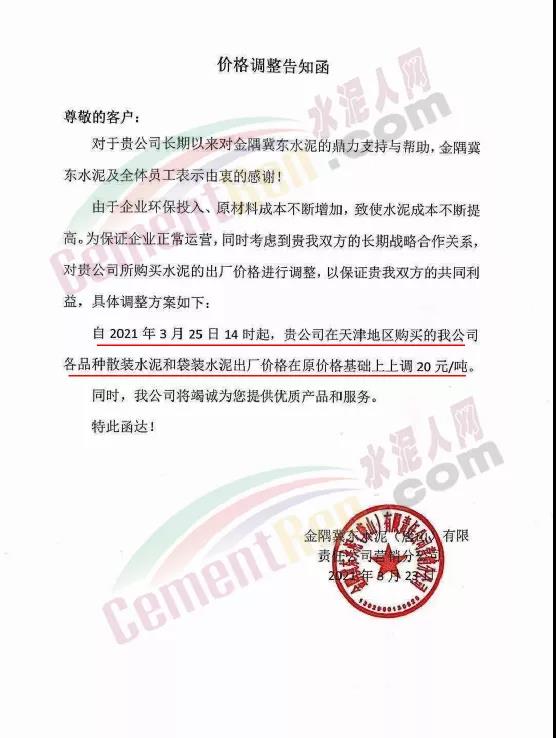 金隅冀東水泥(唐山)有限責任公司營銷分公司通知,由于企業(yè)環(huán)保投入、原材料成本不斷增加,致使水泥成本不斷提高。為保證企業(yè)正常運營,對水泥的出廠價格進行調(diào)整,自2021年3月25日14時起,天津地區(qū)各品種散裝水泥和袋裝水泥出廠價格在原價格基礎上上調(diào)20元/噸。