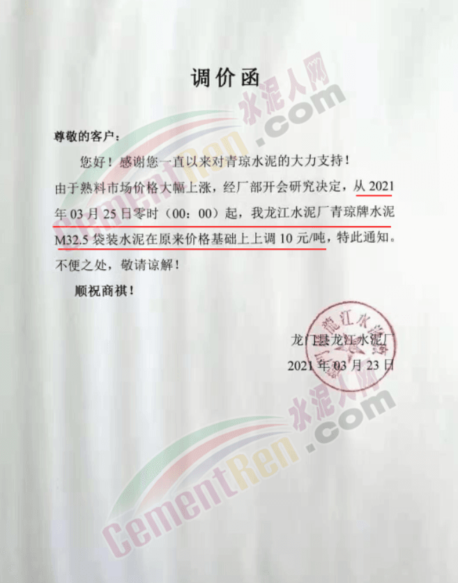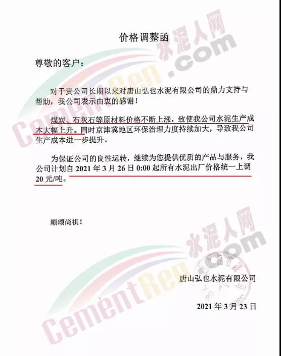 唐山弘也水泥通知因煤炭、石灰石等原材料價格不斷上漲,致使公司水泥生產(chǎn)成本大幅上升。同時京津冀地區(qū)環(huán)保治理力度持續(xù)加大,導致公司生產(chǎn)成本進一步提升。為保證公司的良性運轉(zhuǎn),自 2021年3月26日零點起所有水泥出廠價格統(tǒng)一上調(diào) 20元/噸。