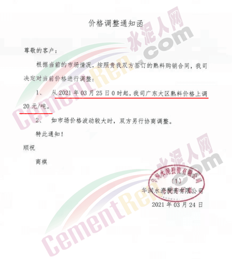 廣東區(qū)域主要品牌企業(yè)華潤水泥自3月8日、18日兩次上調(diào)熟料價格以來,近日再發(fā)通知稱,自3月25日0時起,廣東大區(qū)熟料價格上調(diào)20元/噸,三輪累計上調(diào)已達60元/噸。