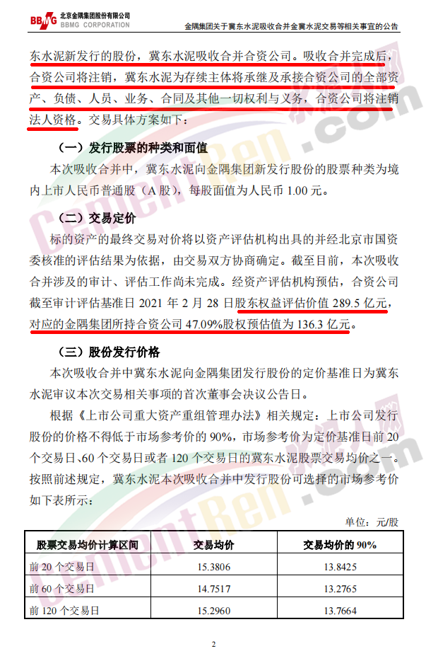 3月31日晚間,上市公司北京金隅集團股份有限公司發(fā)布《關(guān)于唐山冀東水泥股份有限公司吸收合并金隅冀東水泥(唐山)有限責任公司交易等相關(guān)事宜的公告》稱:2021年3月31日,北京金隅集團股份有限公司第五屆董事會第三十二次會議審議通過了《關(guān)于唐山冀東水泥股份有限公司吸收合并金隅冀東水泥(唐山)有限責任公司交易等相關(guān)事宜的議案》,同意公司以所持金隅冀東水泥(唐山)有限責任公司47.09%的股權(quán)認購唐山冀東水泥股份有限公司新發(fā)行的股份,由冀東水泥吸收合并合資公司。同日,公司與冀東水泥、合資公司簽訂附生效條件的《吸收合并協(xié)議》。