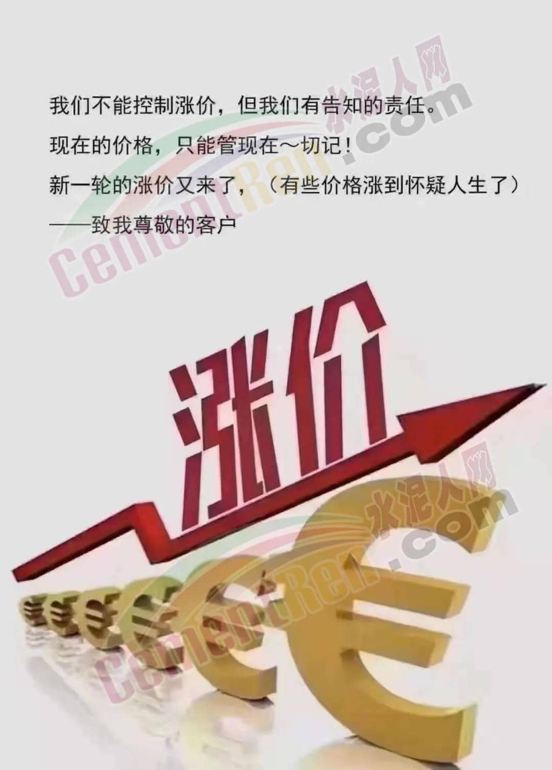 有水泥經(jīng)銷(xiāo)商發(fā)致客戶(hù)稱(chēng):“我們不能控制漲價(jià),但我們有告知的責(zé)任?,F(xiàn)在的價(jià)格,只能管現(xiàn)在~切記!新一輪漲價(jià)又來(lái)了,有些價(jià)格漲到開(kāi)始懷疑人生了!”