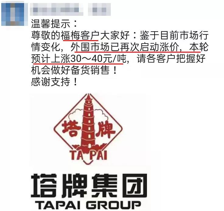 塔牌水泥經(jīng)銷(xiāo)商通知,鑒于目前市場(chǎng)行情變化 ,外圍市場(chǎng)已經(jīng)再次啟動(dòng)漲價(jià),本輪預(yù)計(jì)上漲30~40元/噸。