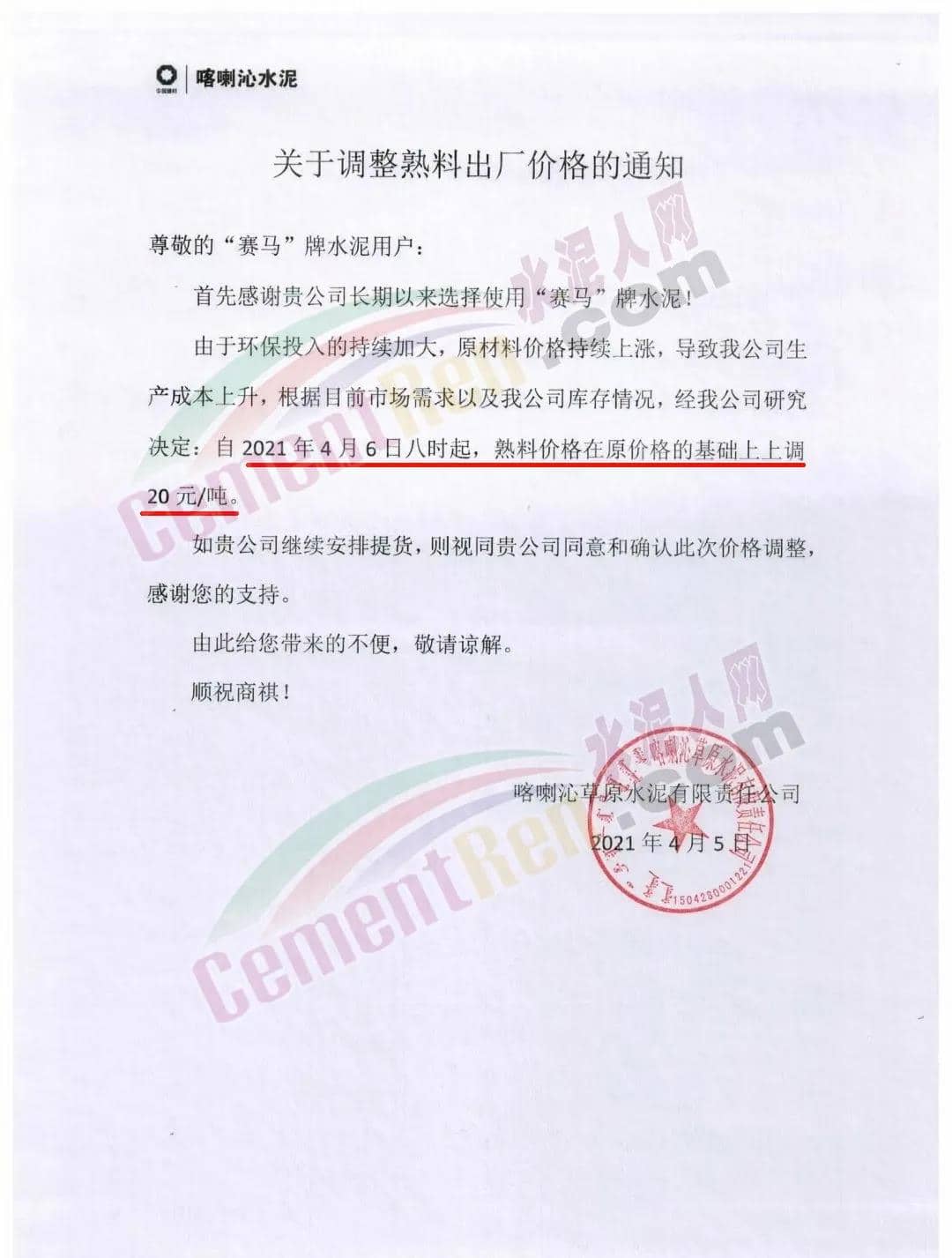 寧夏吳忠賽馬新型建材有限公司通知,由于原材料采購(gòu)價(jià)格持續(xù)上漲的原因,結(jié)合市場(chǎng)情況,經(jīng)公司研究決定 ,自4月6日零時(shí)起,公司各品種規(guī)格水泥在原價(jià)基礎(chǔ)上上調(diào)20元/噸。