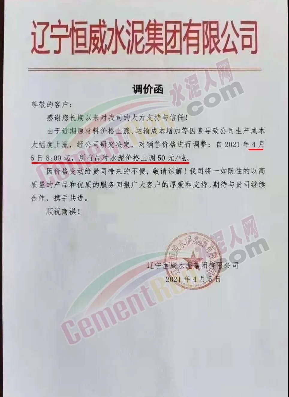 遼寧恒威水泥集團(tuán)通知,由于近期原材料價(jià)格上漲,運(yùn)輸成本增加等因素導(dǎo)致公司生產(chǎn)成本大幅度上漲,經(jīng)公司研究決定,對(duì)銷(xiāo)售價(jià)格進(jìn)行調(diào)整,自4月6日8時(shí)起,所有品種水泥價(jià)格上調(diào)50元/噸。