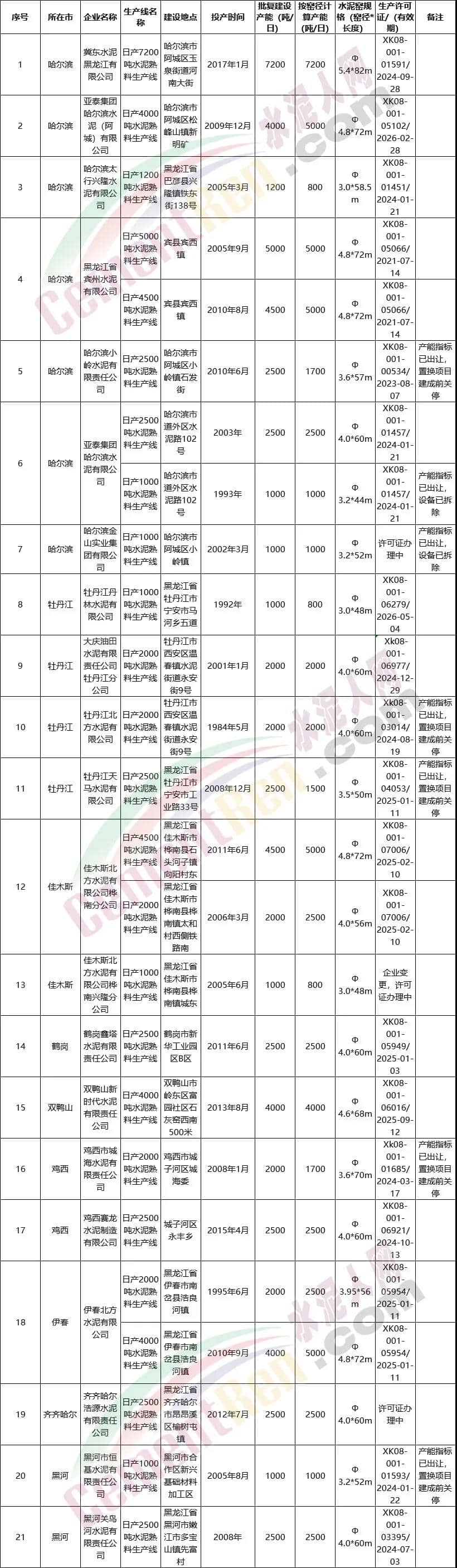 黑龍江省2020年度水泥熟料生產(chǎn)線清單