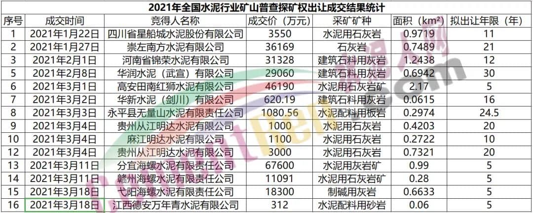 江西德安萬(wàn)年青水泥有限公司以312萬(wàn)元竟得江西省德安縣長(zhǎng)溪巖水泥配料用砂巖礦普查探礦權(quán);