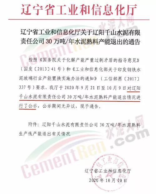 據(jù)了解,去年10月10日,遼寧省工信廳發(fā)布了《遼寧省工業(yè)和信息化廳關(guān)于遼陽千山水泥有限責任公司30萬噸/年水泥熟料產(chǎn)能退出的通告》對遼陽千山水泥有限責任公司30萬噸/年水泥熟料產(chǎn)能退出情況進行公示,赤峰山水遠航水泥有限公司及廣西合山虎鷹建材有限公司分別受讓750t/d水泥熟料產(chǎn)能、250t/d水泥熟料產(chǎn)能。