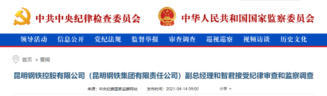 中央紀委國家監(jiān)委網(wǎng)站訊 據(jù)云南省紀委監(jiān)委消息:昆明鋼鐵控股有限公司(昆明鋼鐵集團有限責任公司)副總經(jīng)理和智君涉嫌嚴重違紀違法,已主動投案,目前正在接受紀律審查和監(jiān)察調(diào)查。